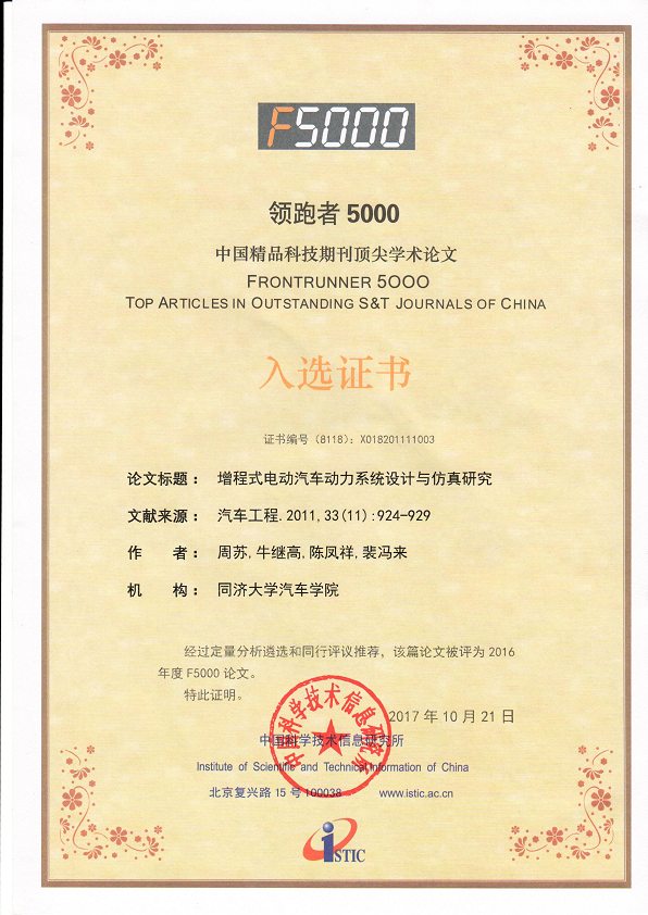 又有一篇论文“周苏,牛继高,陈凤祥,裴冯来,增程式电动汽车动力系统设计与仿真研究,汽车工程,2011,33(11):924-929”经定量分析遴选和同行评议推荐,被评为2016年度F5000论文。