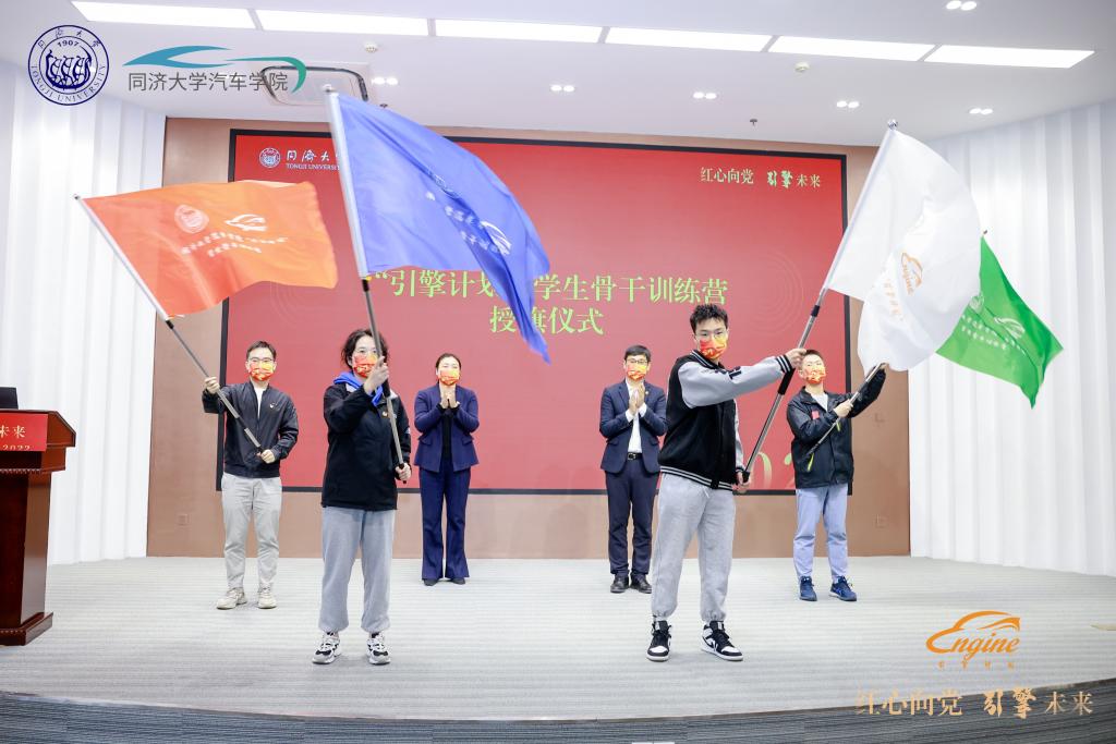 唐志宇老师、曹静老师为学生骨干代表授旗。