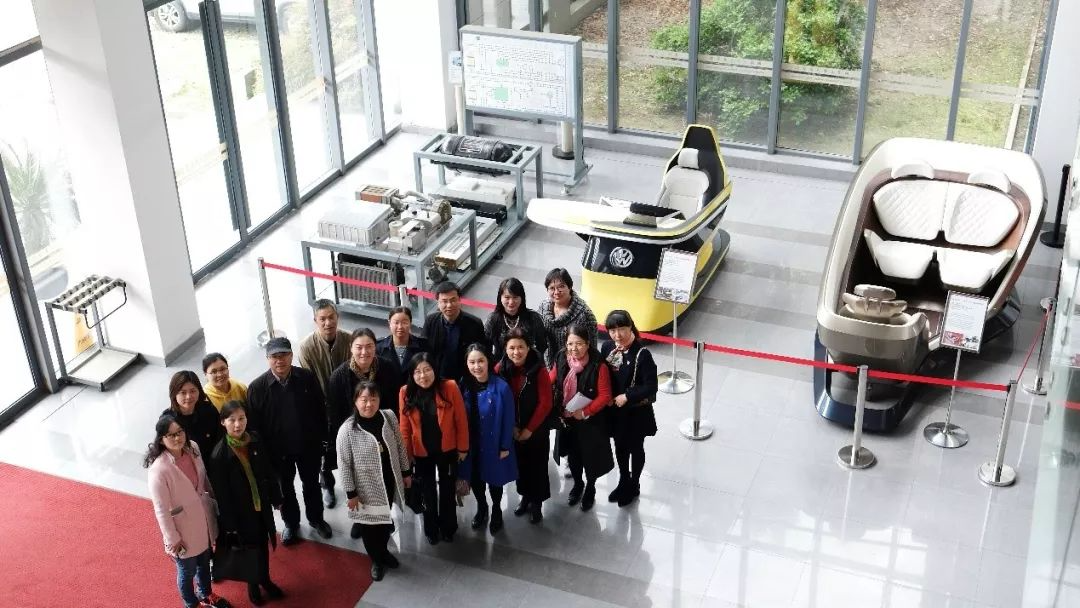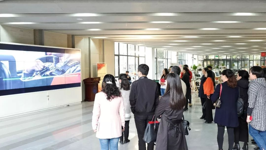 大厅的勤工助学咖啡吧、书画作品展示区、党建图书角、车队成果展示区及大学生科技创新实践工作室,感受学院科技、艺术、人文相互交织的文化氛围,并合影留念。