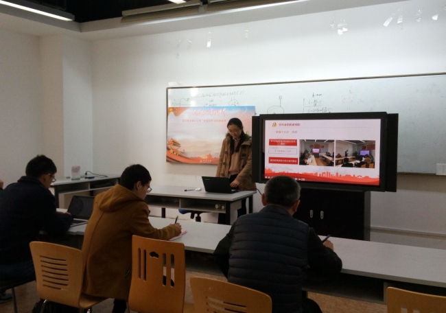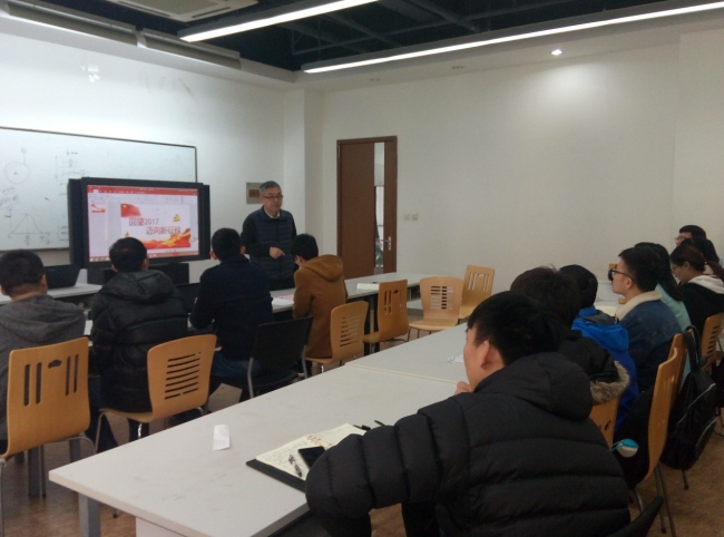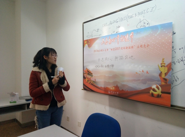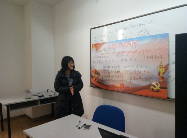 首先,支部书记唐旭辉带领支部党员回顾了党支部2017年的收获,总结了不足。2017年,在各位党员同志的共同努力下,党支部成功举办了特色活动“党的历史缩影”,其由“回顾党代会”展示活动、“学习十九大精神”时政座谈会和“亲临十九大”模拟时政座谈会三个部分组成,并制作了微党课视频。党支部从建立到逐步走上正轨,制度建设逐渐加强,凝聚力逐渐提升。唐旭辉同志对明年的支部组织生活提出了新的目标:党支部生活更加多元化,支部生活会制度化,支部凝聚力进一步加强,党员意识、党性修养进一步提升。