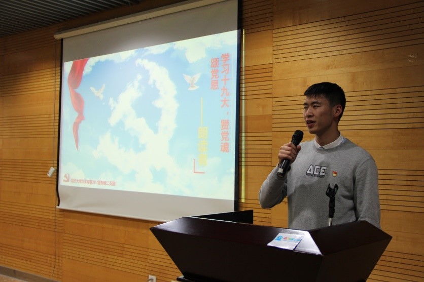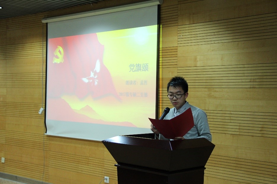 A311举办了 “学习十九大,赞党魂,颂党恩”主题朗读比赛。此次活动旨在通过朗读与学习“十九大”主题相关的文学作品或原创作品,表达青年党员对党和祖国的赞美和热爱。2017级专硕二支部全体党员和积极分子共18人参与了本次比赛,比赛由支部书记张文剑主持,2017级研究生支部书记担任评委。