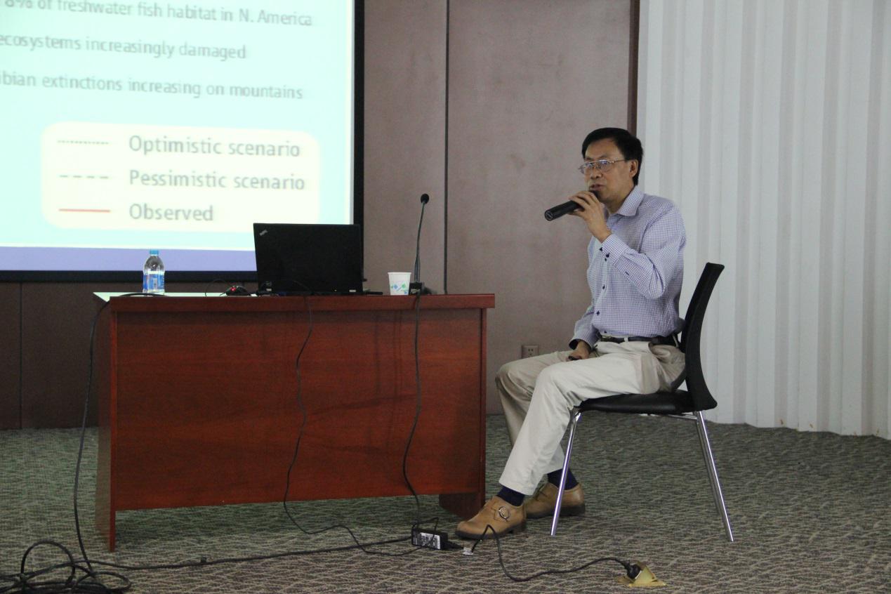 党委副书记曹静老师、学工办葛畅老师。首先,曹静老师对王教授的到来表示欢迎,并介绍了王汝建教授的经历。王汝建教授为理学博士,师从中国科学院院士汪品先教授,主要从事新生代以来低纬度太平洋、南极和北极高纬度海域的微体古生物学、古气候和古海洋学研究。