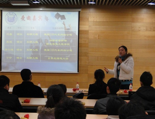 党总支副书记曹静老师致辞,欢迎同学们来到学术沙龙现场,并且鼓励大家群策群力,共同把学术沙龙活动做好。之后由邀请到的四位高年级研究生与大家共同分享了他们短期出国进行学术交流或实习的经验,包括前期准备、科研经历、国内外文化差异、所见所感等等。刘矗学长用其生动诙谐的言语向同学们描绘了他在德国汽车网络公司的生活以及工作的场景,从生活文化角度讲述了在德期间的住院经历、德国人民的热情好客以及德国先进的设备和生活理念;李仁俊学长通过自己这次短期出国的经历和经验为同学们总结了如何获得短期出国机会(双学位、出国实习等)、如何为短期出国做准备(语言证书)、出国前与出国后的准备工作以及注意事项;张诚学长为大家介绍了他在法国布雷斯特留学时的趣闻、科研内容和一些旅游指南等;丁宁博士则为同学们讲述了他在日本的所见所闻以及这次经历给他带来的收获等。
