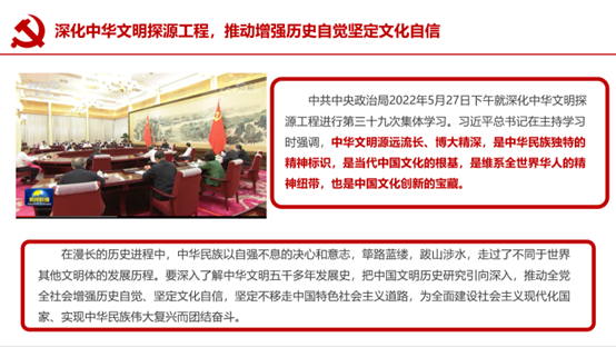 科技创新基地党支部的唐上钦同学为大家详细介绍了中华文明探源工程。2022年5月27日下午,中共中央政治局就深化中华文明探源工程进行第三十九次集体学习。习近平总书记在主持学习时强调,中华文明源远流长、博大精深,是中华民族独特的精神标识,是当代中国文化的根基,是维系全世界华人的精神纽带,也是中国文化创新的宝藏。
