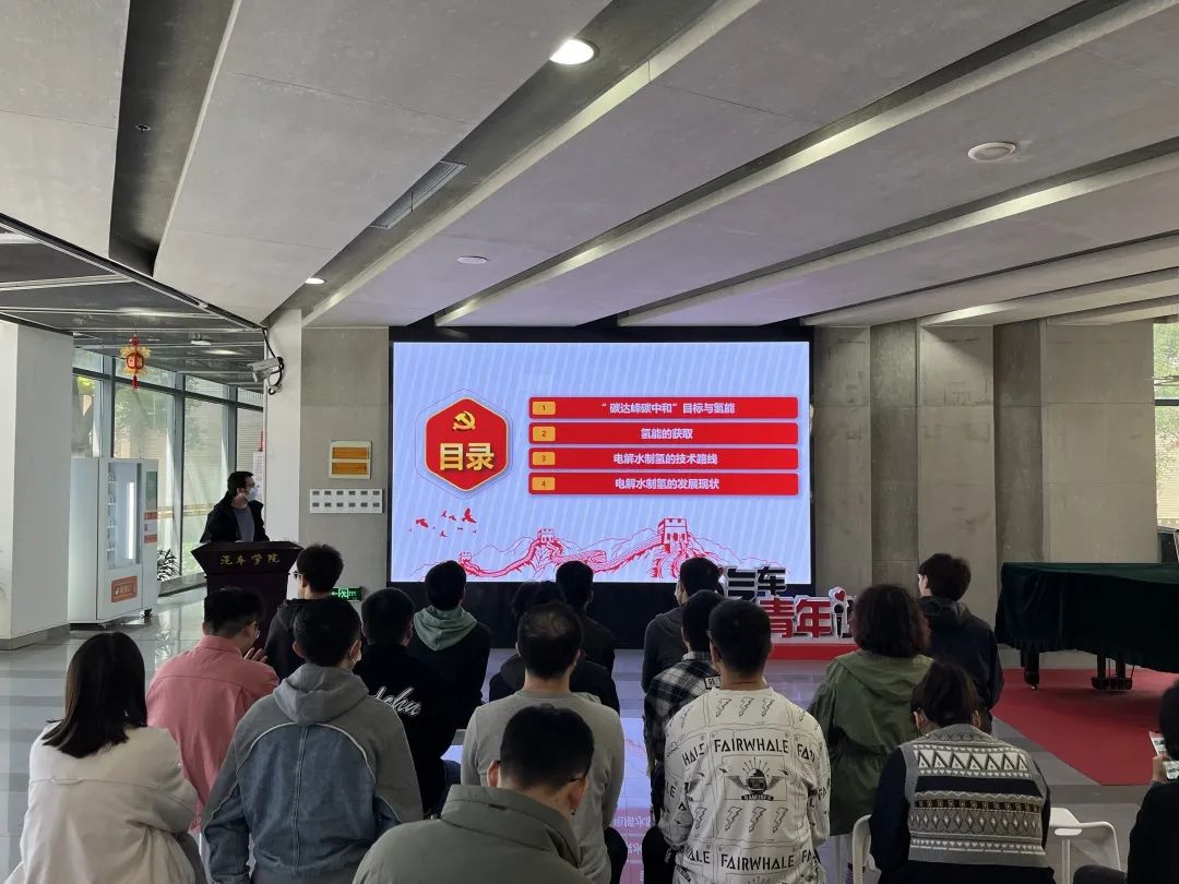 随后,研究生第十党支部张浩宇同学进行了题为“电解水制氢”的专业分享。他从“碳达峰碳中和”目标与氢能、氢能的获取、电解水制氢的技术路线以及电解水制氢的发展现状等四个方面进行介绍。综合电解水制氢的发展现状,他指出目前仍存在以下问题:(1)对电解槽系统规律的认识:不同变量对电解槽电压、阻抗变化规律及其机理认识不够清晰,故障及故障诊断没有共同认识;(2)电解槽状态及寿命评估:电解反应过程及其传质传热机理复杂,电解衰减机制不明确,无法实现寿命准确评估;(3)与可再生能源的匹配:可再生能源的波动导致电解槽寿命的缩短,多个电解槽的寿命管理。