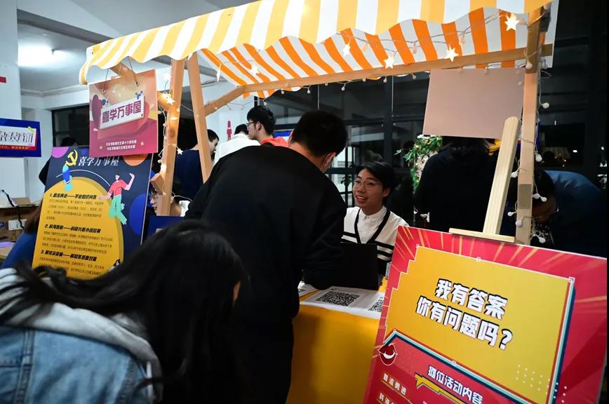 “喜学万事屋”活动于11月5日在友园第7,8号公寓楼一楼大厅内开展。活动包括五个部分的内容,分别是:题流勇进——学业知识问答、科海偕航——科研兴趣小组招募、解忧杂货铺——解疑答惑面对面、心愿百事通——学业心愿一帮一、队友集合——学业“微”社区。