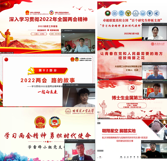为深入学习贯彻全国两会精神,提高党员的政治素质和理论修养,增强党支部的创造力、凝聚力和战斗力,2022年3月16日下午,卓越联盟高校8个全国“百个研究生样板党支部”联合开展了“学习两会精神 勇担时代使命”云端共建活动。本次学习共有来自疯情书库