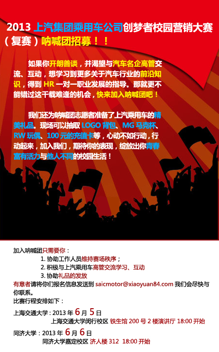 自主、创意、梦想,关注上汽乘用车“创梦者”校园营销大赛(复赛),相信每个人都是自己的英雄,每部车都可能成为传奇,关注自主品牌营销战略!你会在这里发现最值得期待和向往的企业近在咫尺,机会就在你身边。