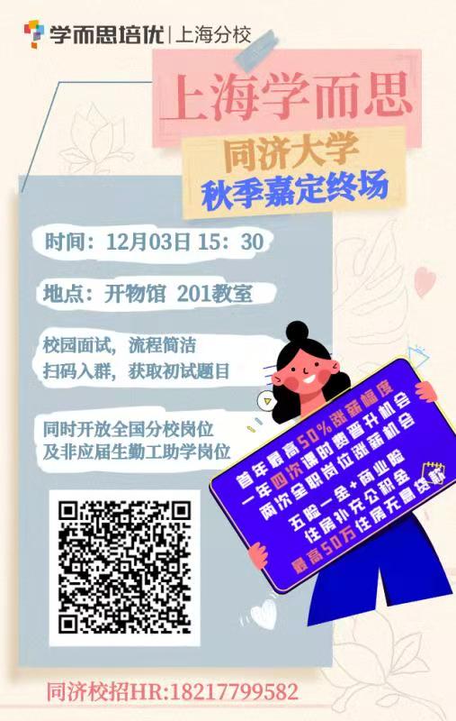 【学而思2021秋招嘉定终场】平台:教育科创企业 薪资:首年12-30万发展:专业➕管理双通道地点:嘉定校区 开物馆 201时间:周四下午(2020年12月3日) 15:30扫码进群了解更多信息✅
