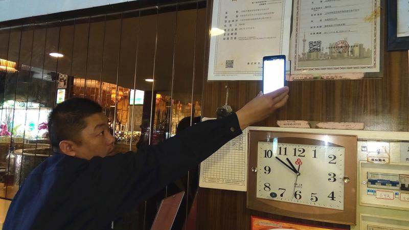 ③ 收运员要打开手机内的专用软件,扫描收运对象店堂内的二维码,记入具体信息,才能去下一站,以防中间环节有人“玩猫腻”——一些没有被记录的“地沟油”偷偷进入了非正规环节。