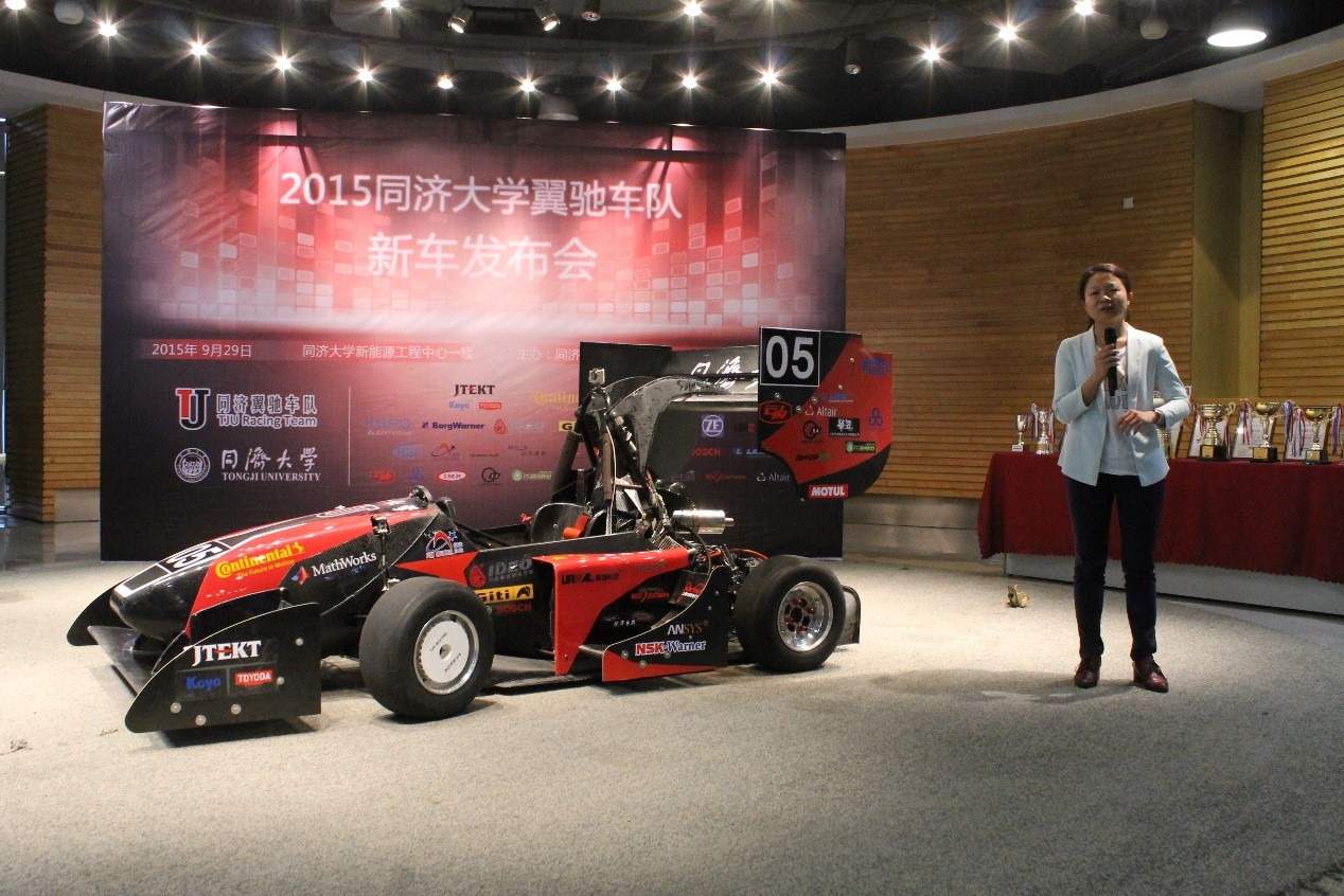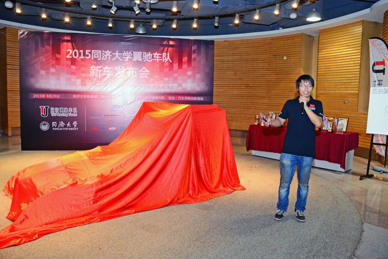 党委副书记史成宇老师,翼驰车队铂金级赞助商捷太格特科技研发中心(无锡)有限公司王凯先生,以及翼驰车队队长傅王梁为翼驰新车揭幕。在全体来宾和车队队员的倒数声中,覆盖着车身的红布被掀起,翼驰车队2015赛季新车TR15就这样展现在众人面前。