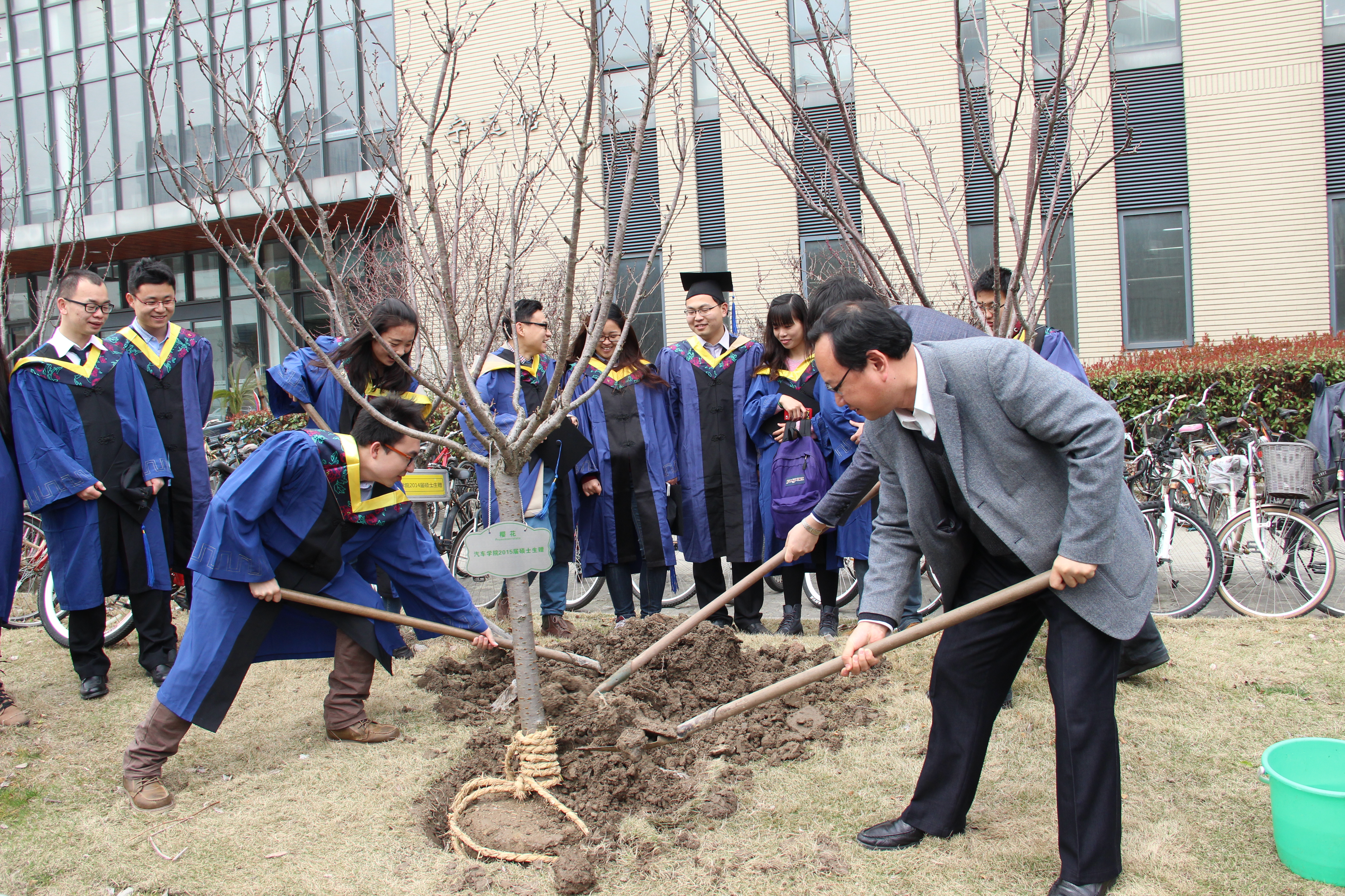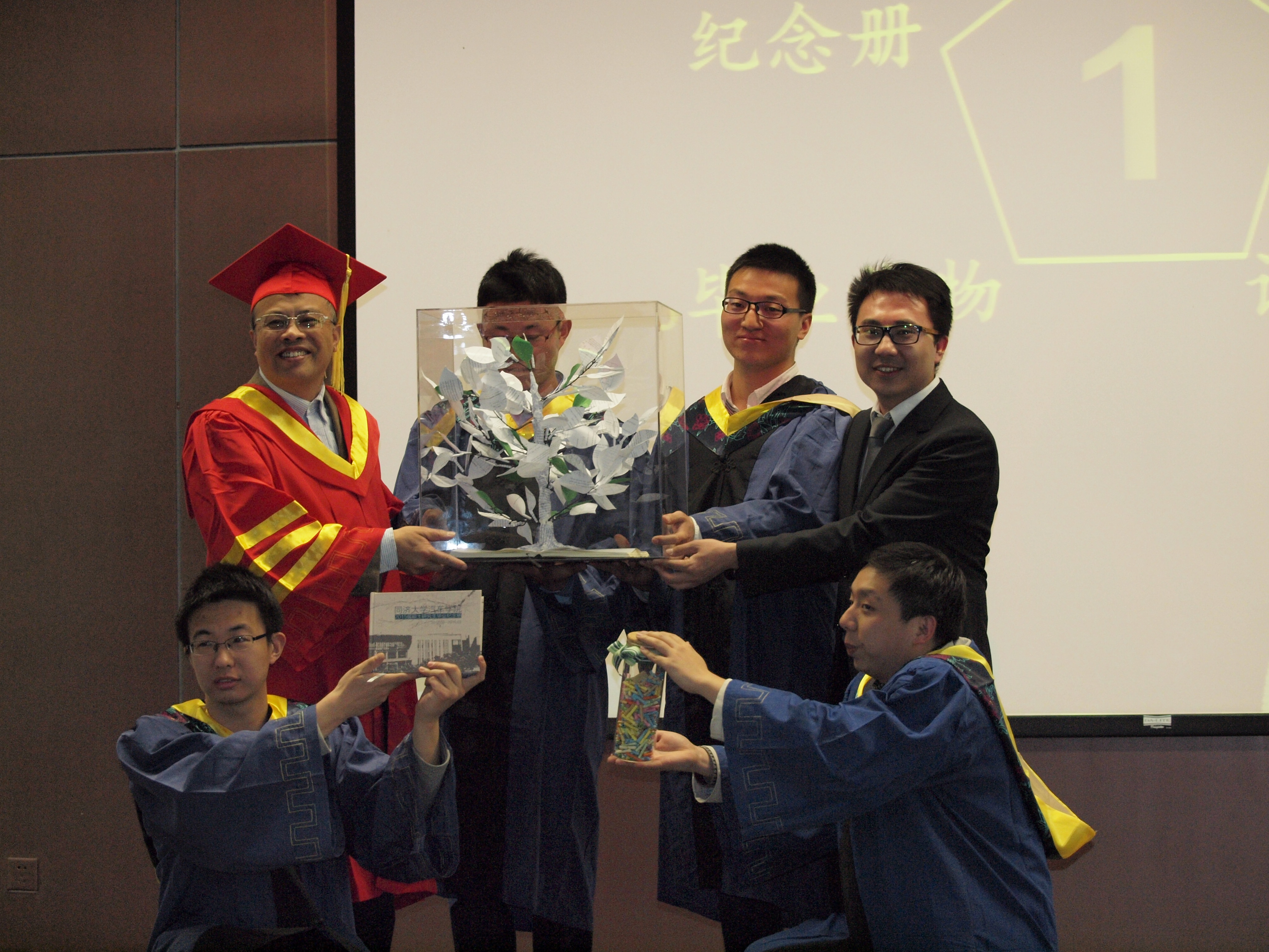 献上2015届毕业生送给学院的礼物:一本纪念册、一棵象征共同成长的樱花树、一个心愿瓶、毕业生捐赠的书籍和象征着汽车知识在同济汽车人身上生根发芽的手工艺品“汽车之树”。在全体毕业生和到场家长们的共同见证下,各位教授上台为毕业生拨穗,并颁发毕业证书与硕士学位证书。最后,在慷慨激昂的《同济校歌》中,2015届研究生毕业典礼圆满结束。