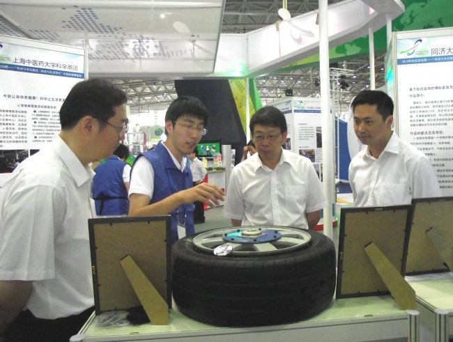 开幕式后,中国科协党组书记、常务副主席陈希在李昕的陪同下来到我校展位进行观摩,我校参展志愿者详细介绍了我校大学生科技创新成果与科技服务的经验与做法,并邀请陈希同志参观了由我校大学生自主设计的第十二届“挑战杯”大学生课外学术科技作品竞赛获奖项目防爆轮胎。陈希对我校科学商店与大学生科技创新成果给与了充分肯定,鼓励现场师生志愿者继续发扬科创精神与同济精神,不断进取创新,利用科学技术与发明创造更好地发挥大学服务社会的功效。