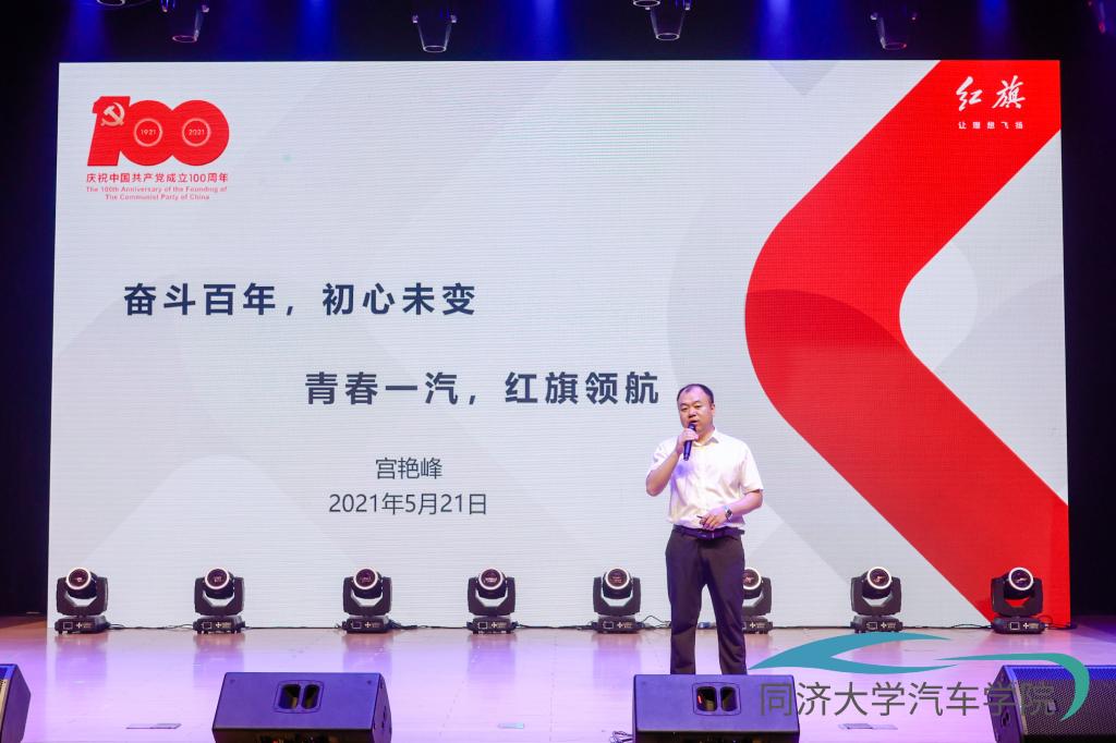 青年教师做主题演讲。一汽集团研发总院动力总成部宫艳峰博士以《奋斗百年,初心未变青春一汽,红旗领航》为题,由总书记视察一汽出发,感悟一汽集团在新时代的定位与发展,介绍了一汽的经典品牌——红旗的改革与创新故事,鼓励青年大学生加强培养个人能力和意识,不断提升自我。东风汽车集团有限公司陈虹吉先生围绕《百年大党,风华正茂;半百东风,仍是少年》讲述了东风汽车建厂初期的艰辛和抗疫中“最飒逆行车”的故事,展现了东风人不屈不挠的“马灯精神”。重庆长安汽车股份有限公司王金汶先生通过《百年复兴路,世纪长安颂》讲述了长安汽车在党旗下实业兴邦、千里西行、结缘汽车、自立自强,不断发展的故事。北汽蓝谷麦格纳汽车有限公司赵鹏先生以《两个奋斗者伙伴,一部世界级好车》为题,讲述了北汽党委如何把方向、管大局、保落实,积极促进企业发展的历程,同时还介绍了北汽与华为合作研发无人驾驶系统的情况。上汽乘用车公司霍飞蛟先生以《建筑·汽车·跨界》为主题,介绍了上汽“R”汽车将中华传统文化融入现代汽车设计美学的故事。吉利汽车研究院有限公司张晓龙先生带来主题演讲《极氪出发,御风前行》,分享了吉利新款车型极氪001中的研发故事。