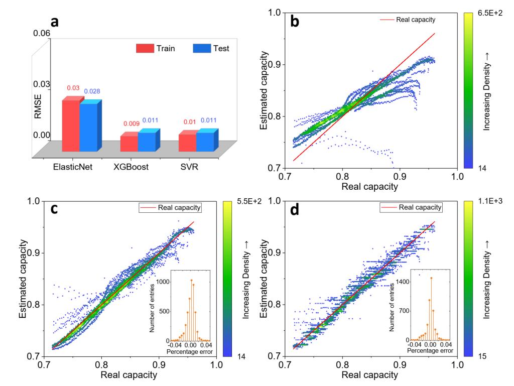 图1提出的容量估计方法在不同的机器学习基础模型上的结果对比。估计误差(RMSE)柱状对比图(a)。三种基础模型ElasticNet(b), XGBoost (c)和Support Vector Regression (SVR) (d)相应的容量真值和估计值对比图。
