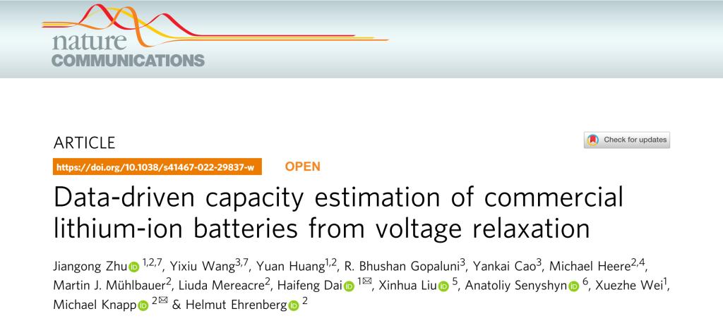 Zhu, J., Wang, Y., Huang, Y. et al. Data-driven capacity estimation of commercial lithium-ion batteries from voltage relaxation. Nat Commun 13, 2261 (2022).