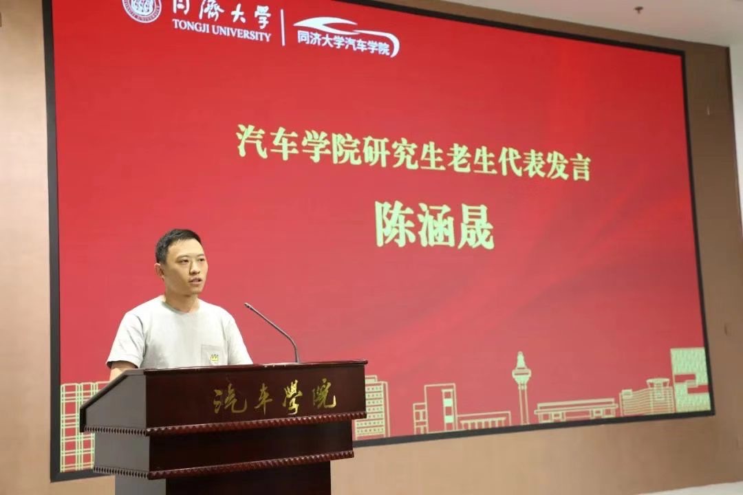 2020级研究生陈涵晟、2022级研究生唐泳健分别代表老生、新生发言。陈涵晟同学分享了他硕士在读期间的科研经历,勉励同学们培养自己的研究兴趣,在科研道路上敢于试错、勇于创新,并强调了基础课程对研究生的重要性。唐泳健代表新生表达了对老师长辈的感恩,表示将不忘初心,牢记使命,坚定理想信念,把论文写在祖国大地上,为中国汽车工业的高质量发展奋勇向前。